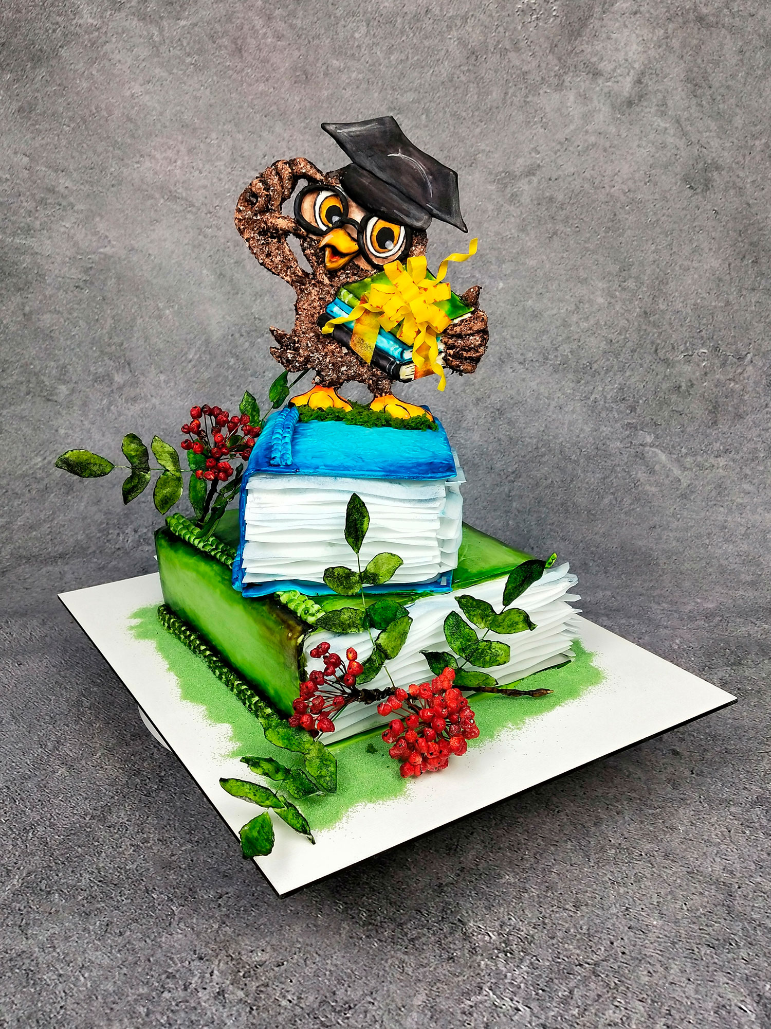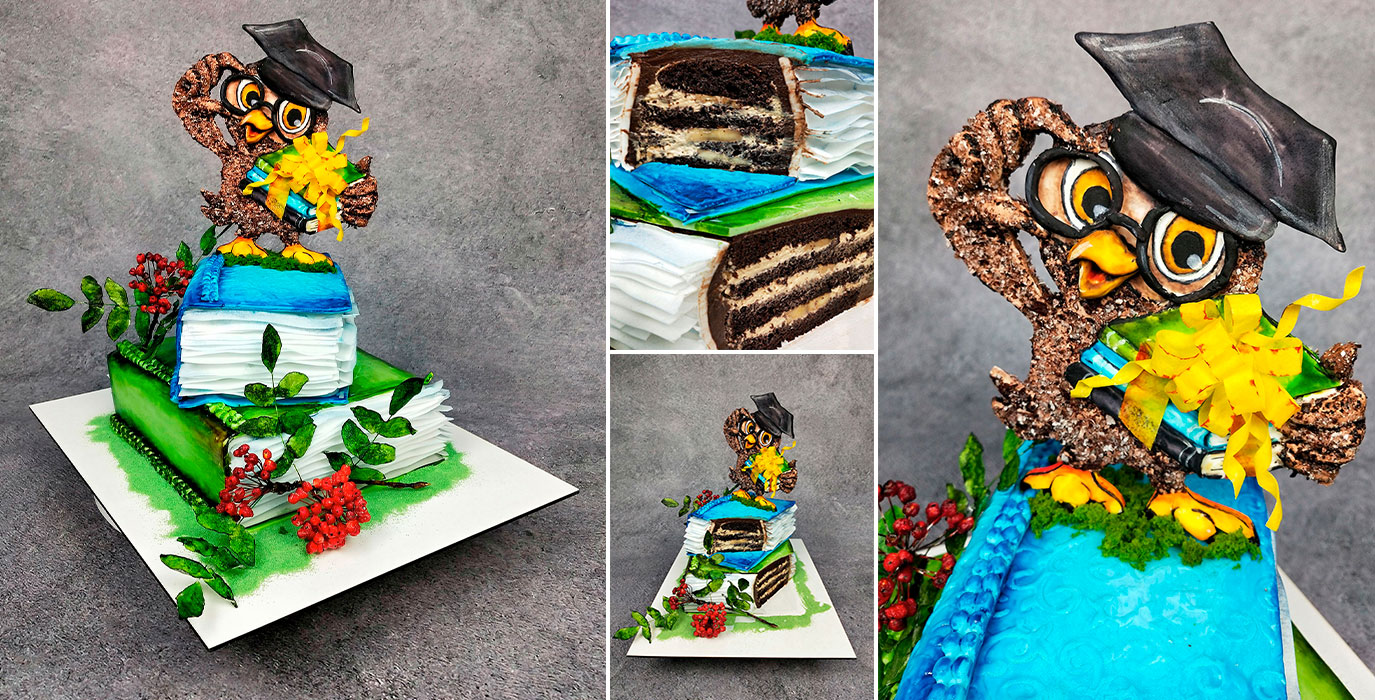 Научитесь выпекать 3D торт в виде книги. Сделаете веточку рябины, аппликацию филина. Узнаете разные техники оформления торта.
