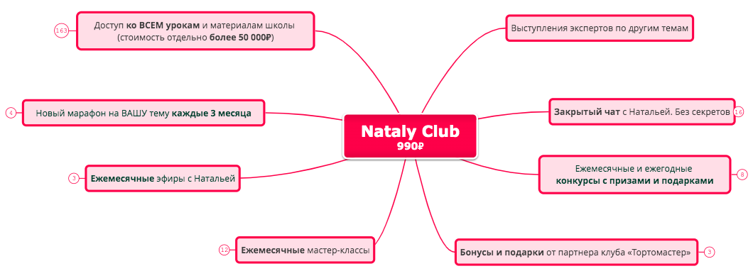 Доступ ко всем материалам школы (более 120 уроков), закрытый чат, ежемесячные мастер-классы, новые марафоны, прямые эфиры с Натальей и другими экспертами, конкурсы, подарки, бонусы от партнера клуба и многое другое.