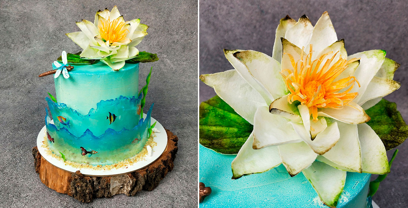 Изготовите вафельный цветок «кувшинка», сделаете водоросли, ракушки, слепите стрекозу и оригинально оформите торт.