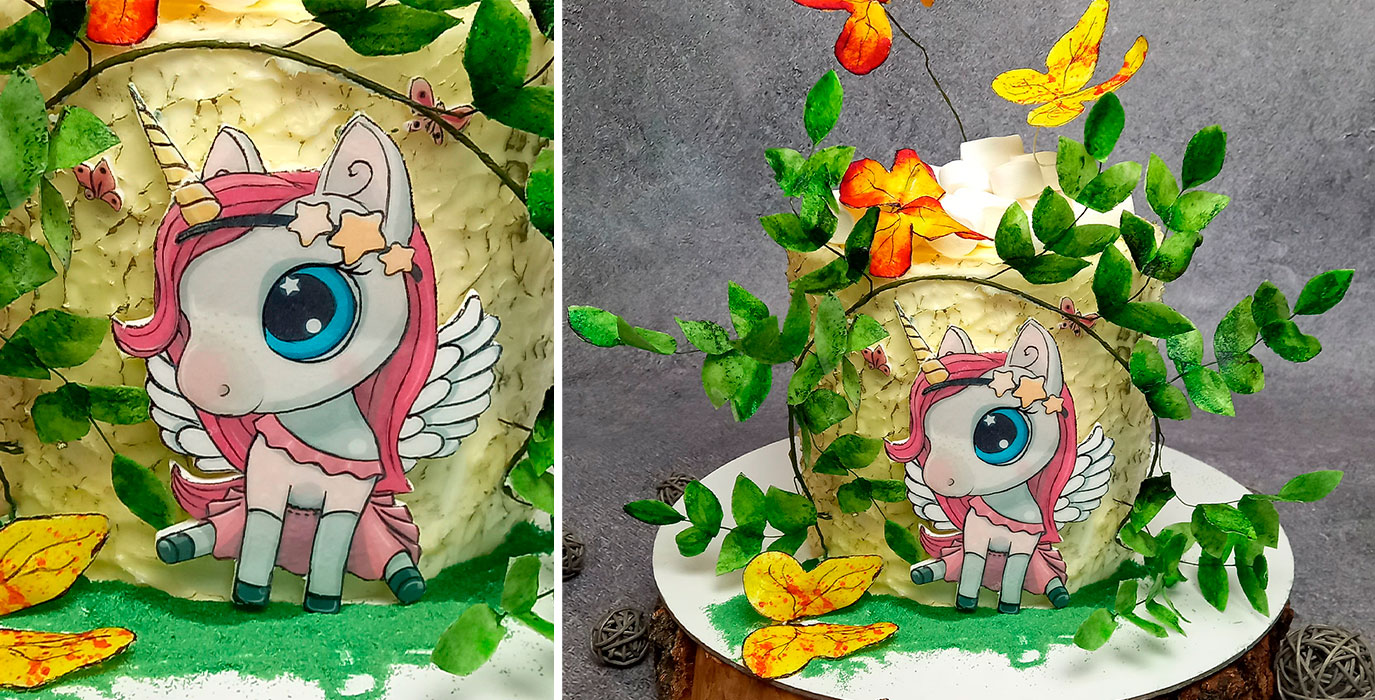 Оформлите торт с помощью разных техник. Сделаете цветы из желатина, зелень из рисовой бумаги, нарисуете яркую аппликацию.